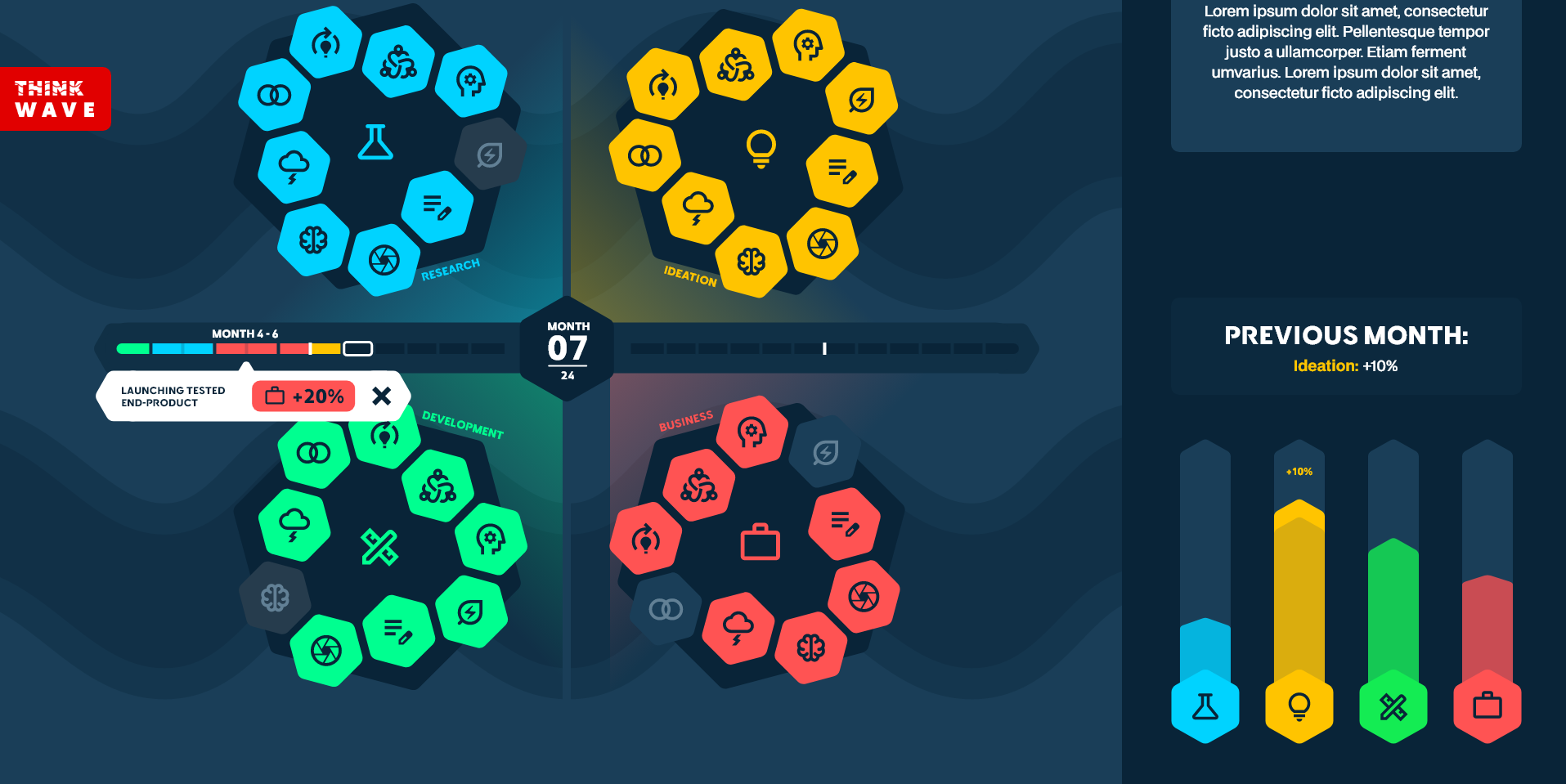 Thinkwave offers an overview of activities that could help your innovation hub, innovation process or start-up while innovating. We keep track of your fuzzy process and stimulate you to take the right actions. Our goal is to stimulate building innovation without forcing you into certain actions. Together we can communicate about what could be the best activity for you to continue your process with. Through offering a broad view of activities we hope to broaden the view and push action and creativity. We want to make innovation a little bit easier by offering a management tool that suits innovative ideas. Improvement based on feedback: - Plug in for existing management systems. - Offering a less action requiered tool in which you can speak or drop files and the tool reads the tekst and puts out boxxes instead of the project leader having to click.